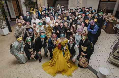 皆様のエスコートカード、実は全て手作り! 披露宴会場のお席には、席札として仮面舞踏会の仮面が 70名様分ひとつとして同じデザインはなく お一人お一人のことを思われてお2人がデザインされました。 ご親族様も含めて皆様が仮面を身にまとい お写真や演出などを楽しまれ酔いしれるひととき... 全員集合写真は圧巻です!
