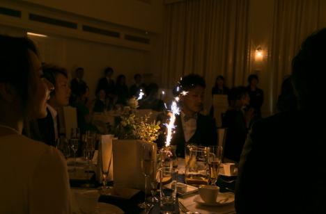 お色直し中、ゲストの方々はリラックスタイム。頃合いを見計らい、お色直しのご入場!映画で例えるなら、ヒーロー登場!ステッキをお持ちになられ、ご入場曲に合わせて花火が噴き上がるご演出を取り入れられました☆ゲストの方々も大盛り上がり!