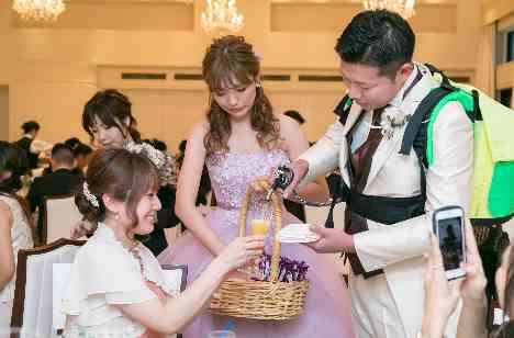 お色直しのご入場では、ご新郎様はビールを担ぎ、ご新婦様はおつまみをお持ちになられご入場。お酒好きのゲストの方々も満面の笑みとなりました☆ご新郎様側のゲストテーブルではビールサービスの演出に大変盛り上がりました。