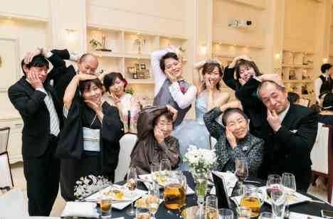 お色直しをしてご登場…! そのまま、皆様のテーブルに各テーブルの皆様とお写真を撮りながらご挨拶へ進んで頂きますが… 今回の各卓スナップはお2人がご用意された指定ショットからお好きなポーズをお選びいただきます! 新婦様のご親族様のテーブルでは、おばあ様が「芸人の小藪ポーズ」を率先してチョイスしていただき、素敵なお写真をお撮りさせていただきました(^^)♪