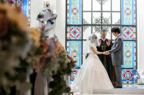ドレスはセミオーダーでご用意致しました。純白のドレスに包まれて、ブルーのステンドグラスと相まって思い出に残る一枚となりました。幻想的な雰囲気に包まれたおふたりをご覧になられたゲストのみなさまは、感動されて涙を流される方もいらっしゃいました。