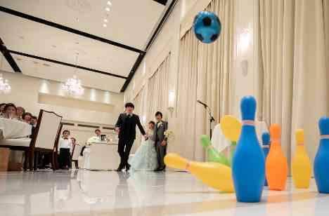 友人に余興をお願いすると負担が掛かってしまう...。ゲストのみんなには負担を掛けずに、ワイワイ楽しめる余興を新郎新婦様がお考えになられました。 新郎様は学生時代にサッカーをされており、ご友人たちもサッカー経験者。新郎様を含め代表者が3人いらっしゃり、順番にボールを蹴って誰が一番多くピンを倒せるか予想して頂き、見事正解されたゲストには景品をプレゼント! 見事、新郎様が一番多くピンを倒せました♪