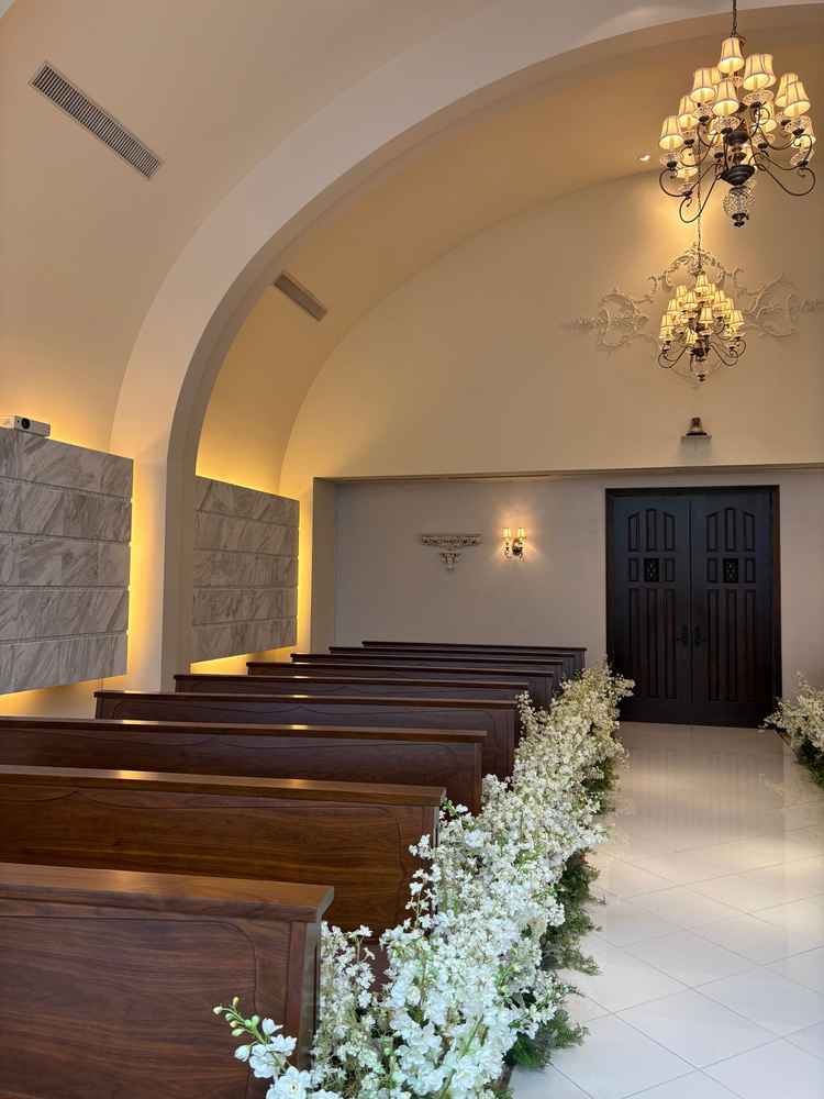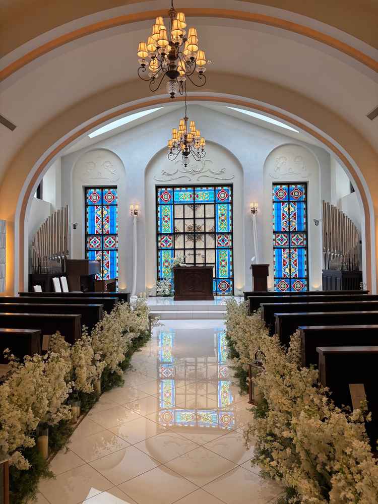 挙式会場のスタンドグラスは綺麗でした。床の大理石の反射や天井の採光など、会場全体が明るく見える工夫が見られました。