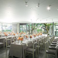 【オープンキッチン併設!パーティー体感】2面ガラス張りの開放的な空間は大人なウエディングを演出。貸切だからこそ叶うシェフの演出も人気。トータルコーディネートでおふたりらしいパーティーを叶えよう。