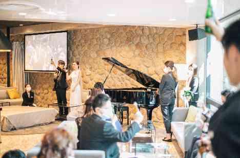 演出をたくさん盛り込むよりもゲストの皆様との自由なお時間を多く取り入れるような演出に。挙式後はアペリティフパーティーにて大好きなお酒でリラックスした時間を過ごされました。ゲストの皆様のご不安を少しでも軽減できるようにと、おふたりご自身もアルコールやウエットティッシュなどをご準備してくださいました。歓談をたくさんとったからこそ、密を緩和しながらゲストの皆様とゆっくりお写真タイムも楽しまれました。