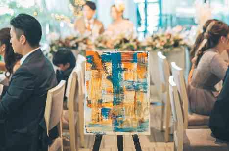 このかけがえのない時間を形のある想い出に残そうと、ゲストの皆様に描いていただく「キャンバスアート」を計画なさいました。キャンバスをウエイティングスペースにご用意され、ウエイティングのお時間に、ゲストの皆様に思い思いに筆をとっていただきました。大切なゲストの皆様の手によって描かれた世界に一つだけのキャンバスアートは、おふたりにとってもかけがえのない宝物になられたことと思います。