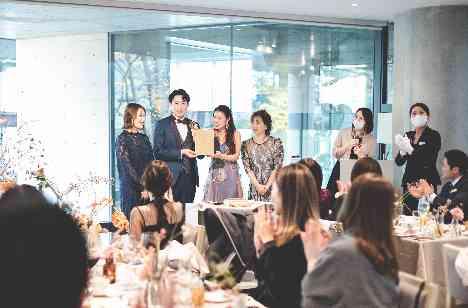 ゲストと一緒に何かを創り上げたいとの想いが強かったおふたりは『真鍮アート』を選ばれました。真鍮アートとは、真鍮プレートにおふたりとゲストのお名前を刻んでいただいて完成する結婚証明書のこと。ゲストの皆様には待合スペースにてイニシャルを刻印いただき、新郎様と新婦様にはゲストの目の前でお名前を刻印いただきました。世界に一つだけの結婚証明書が完成し、ゲストの心にも強く印象付けられた素敵な演出となりました。