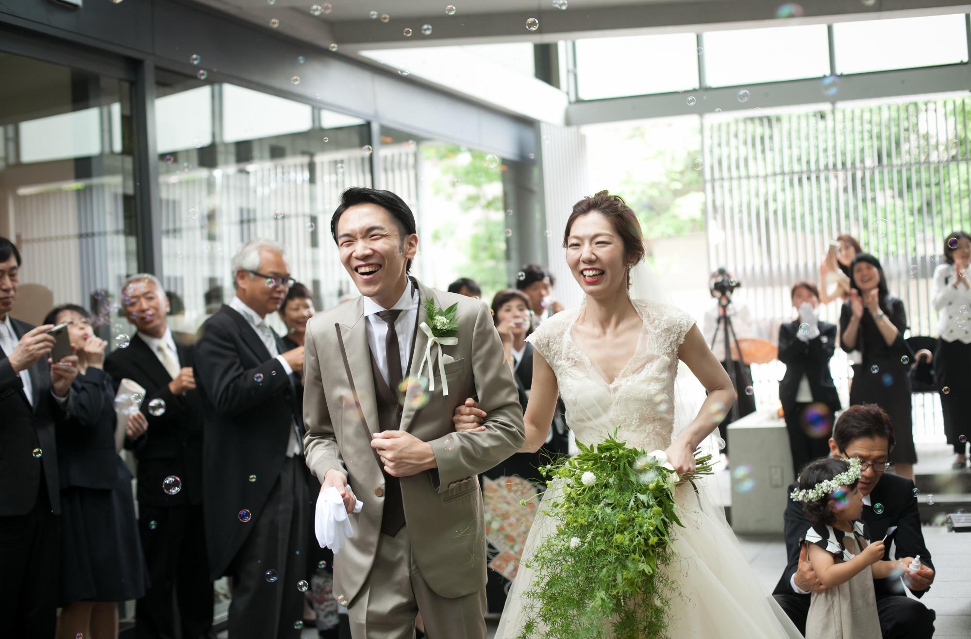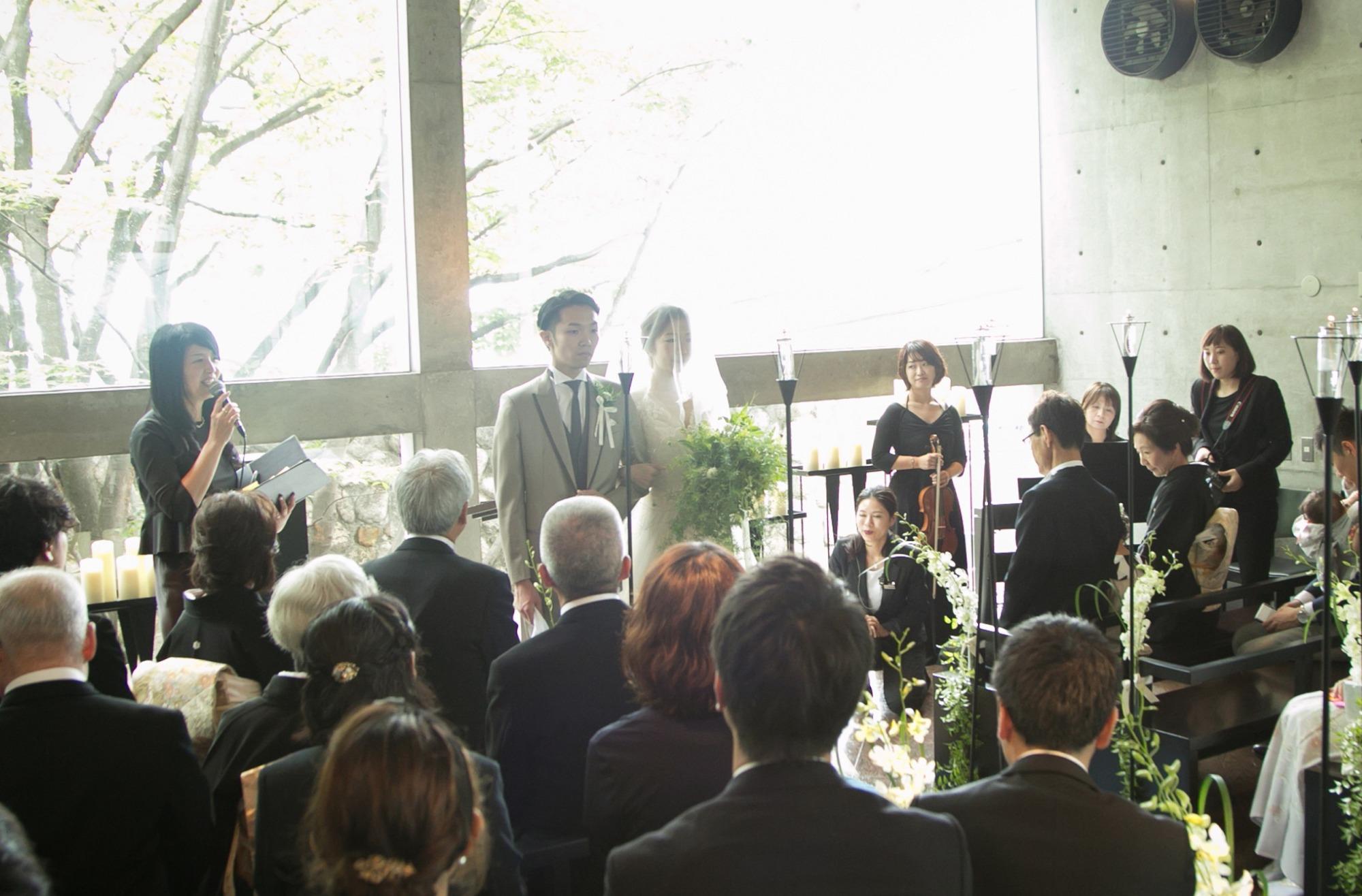 窓の外の青々としたケヤキの大木に見守られた人前式での誓いの言葉。新郎様、新婦様それぞれのご友人2名に、会場を代表して問いかけを投げてもらう呼びかけ式の誓いの言葉に、感動して涙されるゲストの姿も。おふたりのお人柄も伝わってくる問いかけのエピソードに、ゲストのみなさまも温かい気持ちになり、祝福に満ちた時間となりました。