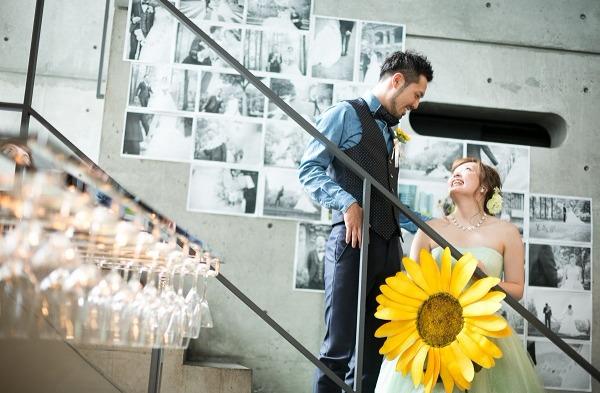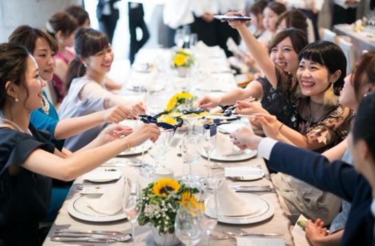 各卓のあちこちに咲き誇るひまわりの花やカスミソウの装花で、真夏ムードも最高潮。晩餐会スタイルの長テーブル席では、手作りのフォトプロップスで盛り上がるゲストの姿も。「ゲストが私たちの席に来るたび、『ここの料理すごくおいしいね!』と絶賛。祖母が育てたお米を使ったお茶漬けも大好評で嬉しかったです」。