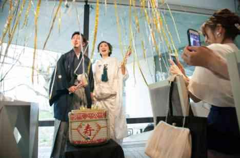 1階ラウンジでのアペリティフパーティの後、2階へ移動して披露宴がスタート。お色直しには艶やかな白無垢と紋付き袴姿で登場され、クラッカー樽のオープンでゲストの皆様も盛り上がっていらっしゃいました。ゲストの方々による余興タイムでは、新郎様から新婦様へサプライズのプロポーズがあり、見守る皆様の中には感極まって涙する方もいらっしゃるほど、感動的なワンシーンとなりました。