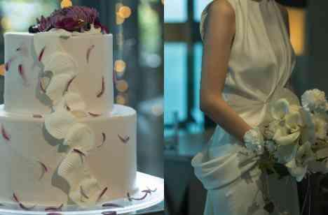 ウエディングケーキは、おふたり自ら手書きでデザインを描いてご用意され、形や装飾だけでなく、全体のバランスまで丁寧に考え抜かれたデザインからは、細部へのこだわりと遊び心が感じられました。完成したケーキが登場すると、ゲストからは驚きと歓声が。おふたりでしか表現できないケーキは、披露宴の中でも印象的なシーンの一つとなり、目でも心でも楽しめる演出として、会場の世界観をより鮮やかに際立たせました。