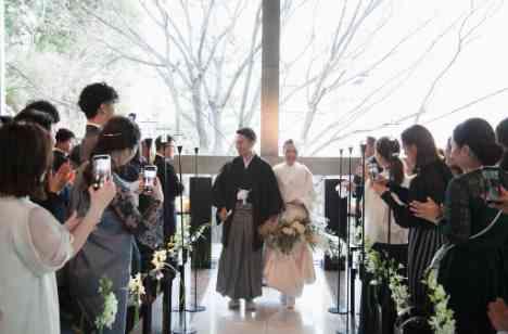 ゲストのみなさまが見守る中、「ヴァージンブリッジ」に姿を見せたおふたり。美しい白無垢に身を包み、チュールのヘッドアクセサリーと季節感を取り入れたリースのブーケは、普段からオシャレな花嫁さまならではのコーディネート。ゲストのみなさまからカメラを向けられ、満面の笑顔で答える新婦さまと、凛々しい紋付き袴姿の新郎さま。惜しみない拍手がおふたりを包み、挙式がスタートしました。