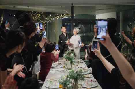 披露宴は、新郎さまのウェルカムスピーチ、晴れやかな乾杯など、和やかな雰囲気で始まりました。歓談タイムでは、小槌でワインの樽を開ける「ワインの樽開き」を披露され、珍しい演出にゲストのみなさまも興味津々! 芳醇な香りが広がる赤ワインは、ゲストのみなさまにも振舞われました。おふたりは見事、誰も見たことがないような、晴れやかな披露宴を実現なさいました。