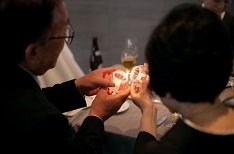 ゲストの皆様が参加され、なおかつ記憶に残る演出として、おふたりは「キャンドルリレー」をされました。 小さなキャンドルのロマンティックな光を、隣の方へと繋いでいきます。 皆で願いを込めながら、一斉にブローアウト。 幻想的な光に包まれた空間は、きっとゲストの皆様の心に残る印象的な時間になったのではないでしょうか。