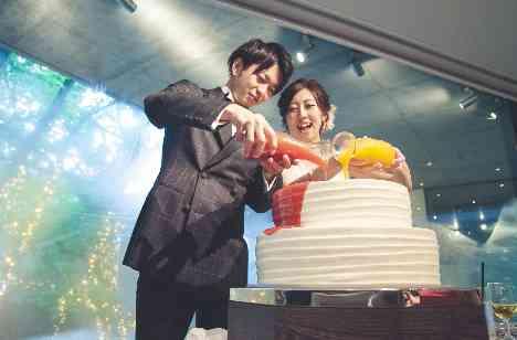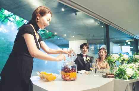 メインとなった演出は、フルーツポンチ作り。5種類のフルーツでご用意したそれぞれの色のイメージに似合うゲストを指名して登場してもらい、調理のお手伝いをいただくというものです。新郎新婦がサプライズで5名をお呼びする形で、ゲストのみなさまもドキドキ。会場が大きく盛り上がりました。完成したフルーツポンチは、デザートビュッフェでご提供。見た目もお味も大好評でした。