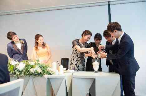 意味を持たせた二色の砂(ベージュ:自然、安らぎ、ホワイト:無限の可能性、新たな出発)をゲストがガラスの器に注ぎ入れる“レイヤーキャンドルサービス”。そして、注がれた砂に立つキャンドルにおふたりがあかりを灯される幻想的な演出は、ゲストからも大好評。おふたりがウエディングテーマとされていた、“あかり”にもピッタリの演出となりました。