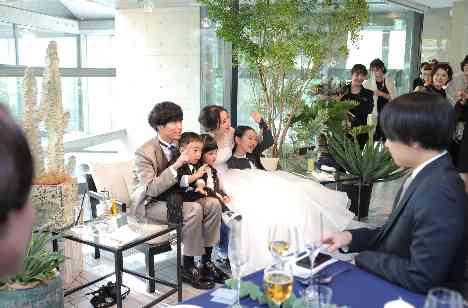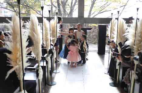 人前式を選ばれたおふたり。お子さまたちやゲストにたくさん登場してほしいという新婦様のご希望から、4人のお子さまたちにフラッグボーイ&ガールをお願いし、祭壇前で「結婚式がはじまるよ!」とかわいいオープニング・アナウンス。受付でゲストに金銀のスタンプで捺印していただいた、結婚誓約書をご披露される演出や、アフターセレモニーでは新郎さま新婦さまそれぞれお菓子ブーケトスをされるなどにぎやかな時間となりました