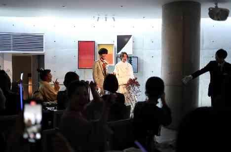 披露宴ではお衣装の色当てクイズを行われました。ゲストのみなさまには受付にご用意したサイリウムの中から予想して色を選び、お色直し入場時に振っていただきました。多くの方はカラードレスを想像していらしたようで、新婦さまが白無垢でご登場されると驚きの声が。一方の新郎さまは和装ではなく、タキシードでご登場されました。大正浪漫風のおしゃれな組み合わせは、いかにもおふたりらしいと大好評でした。