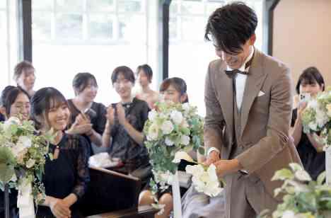 ファーストミートからスタート。ふたりきりのひとときを過ごされたあとには、親御様にも晴れ姿をお披露目したいとの想いから、ファミリーミートをあたたかな陽光がたっぷりと射すチャペルにて実施されました。挙式のはじまりには、新郎様とお父様によるジャケットセレモニーを。ゲストにご協力いただきながらブーケを創り上げる“ブーケストーリー”では、皆様と心をひとつにされました。穏やかな祝福に満ちた人前式となりました。