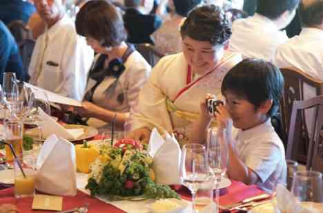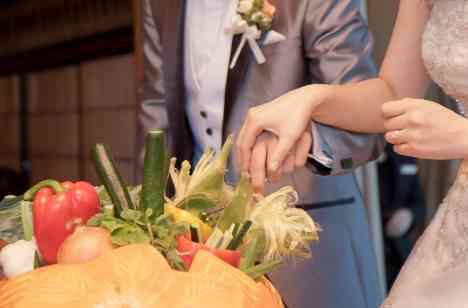 パーティではケーキ入刀以外の演出をご希望され、大きなかぼちゃの中に野菜をたくさん詰め込んで、キュウリのカットスティックでのファーストバイトと、ピクルス作りをご披露されました。野菜はカレーにしてゲストのみなさまに振る舞われ、ご両家のお母さまにはおふたりがカレーのサプライズバイトを行われました。 ゲストのみなさまにも楽しんでいただけた、とてもステキな演出となりました。
