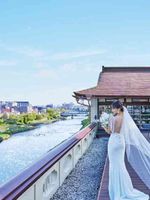 和装にこだわりのあるカップルには、水合わせの儀などを採り入れた和婚式【縁】(えにし)がおすすめ。紋付袴と白無垢の装いで三々九度の盃を交わし、夫婦の縁や家族の縁を固く結び合う。古都を感じる鴨川のほとりで格別の雰囲気を味わう、上質な和婚式を演出。
