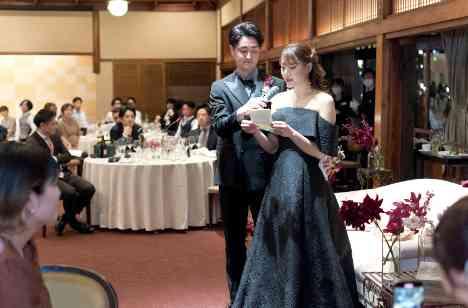 お色直し入場では、ブラックのタキシードとドレスにお召替えをされた新郎様新婦様。おふたりのおしゃれでシックな装いに、ゲストの皆様は魅了されているご様子でした。披露宴ではおふたりが主役になるような定番の演出はあえて取り入れず、ゲストとのご歓談のお時間をなによりも大切にされた新郎様新婦様。ゲストとの会話や写真撮影を、心ゆくまでご堪能され、おふたりの心からの感謝が伝わった素晴らしい一日となりました。