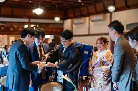 和装姿でお色直し入場されたおふたり。 新婦様は淡い色の色打掛をお召しになり、ふんわりと可憐な印象に。 紋付袴をお召しになった新郎様は、ビールサーバーを背負ってご登場されました。 おふたりからゲストへ直接ビールを振舞われ、おひとりおひとりに伝えられた感謝の気持ち。 あたたかな雰囲気のなかでお料理やお酒を愉しまれ、心もお腹も満たされているご様子でした。