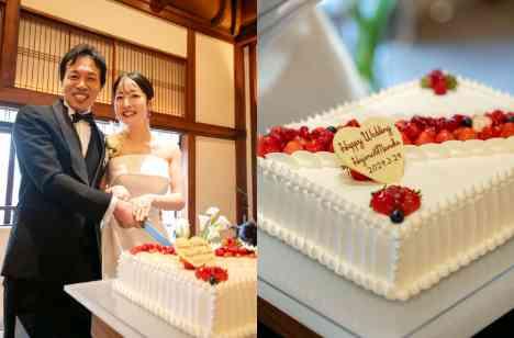 ゲストの乾杯のご発声により、華やかにスタートした祝宴。そして皆様の前に登場したのは、旬のいちごで彩った可愛らしいウエディングケーキ。そっとナイフを入れられたあとには、おふたりで同時に一口。また大切なゲストにも、おふたりの感謝を表すサンクスバイトを。感謝の気持ちに比例しておおきく取り分けられた一口を、幸せそうに口いっぱいに頬張られていました。