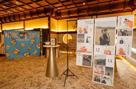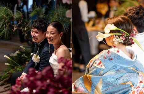 高砂の周囲は、松や木蓮の花で彩り、格式高い印象に。ナフキンには目にも鮮やかなオレンジを採用され、和と洋を織り交ぜた、ハイセンスな会場コーディネートを実現されました。ウエルカムスペースにはフォトブースを設け、ゲストの皆様が写真撮影を愉しまれるお姿も。新郎様新婦様がご用意された、手作りイラストやオリジナルアイテムをじっくりとご覧になり、パーティの開幕を心待ちにされているご様子でした。