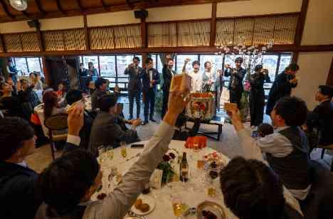 和装にお召替えされたおふたりが、鏡開き演出で会場を盛り上げました。「よいしょ!」の掛け声とともに酒樽を開き、オリジナル焼印入りの枡でお酒を振る舞い、ゲストとの交流を深められました。披露宴の結びには親御様へ感謝を伝え、ご退場の際もゲストに手を振り続けるおふたり。細部にいたるまでおふたりの愛が感じられる一日となりました。