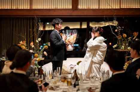 新婦様は日本の伝統美・白無垢にお召替えされご登場。メインテーブルでは写真撮影やご歓談を楽しみ、ゲストとの交流を満喫されました。披露宴の終盤、新郎様から新婦様へ愛の言葉とともに大きな花束のサプライズが。想いをカタチにして届け合う姿は感動的で、今日という日を何度でも思い出したくなるような、心温まるひとときとなりました。