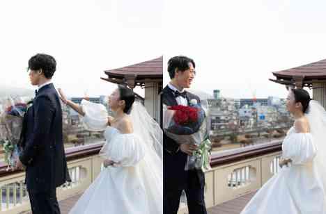 挙式前には屋上で過ごすおふたりだけの時間。大きな花束を手に新婦様を待つ新郎様と、喜びを隠せないおふたりの表情が印象的でした。おふたりがお選びになったのは、大切な人と心を結ぶ“約束式”。お互いのゲストに相手のことを知ってもらえるよう、ひとつひとつの儀式に想いを込められました。退場時には新婦様手作りのシールシャワーで、笑顔あふれる門出となりました。