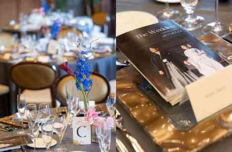 披露宴会場にも、おふたりのこだわりをふんだんに。目にも鮮やかなフラワーに、ダークカラーのクロスをチョイス。コントラストがよく映え、隅々まで洗練された会場コーディネートが実現しました。また、随所におふたりの似顔絵アイテムを採り入れることで、親しみやすい印象に。おふたりのお人柄とこだわりが映し出された、唯一無二の空間が広がりました。