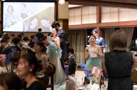 新婦様は爽やかな淡い水色のカラードレスにお召替え。窓の向こうに広がる京都の夜景が、その姿をいっそう美しく輝かせました。披露宴中盤には、お互いのゲストを知っていただきたいと新郎新婦様による“ゲスト紹介”を実施。ゲストのお人柄をおふたりの言葉で伝え、会場は大盛り上がり。結びでは一番に感謝を伝えたい親御様へ、お手紙と花束を贈り、想いを届けられました。