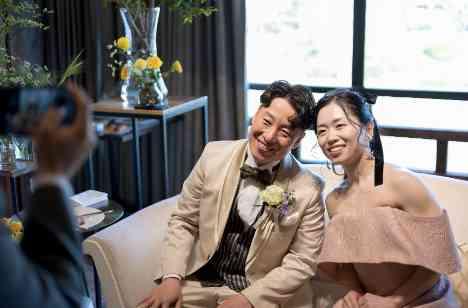 お色直し入場では、おふたりとも洋装にお召替え。新婦様は気品と可憐さをあわせ持つピンクベージュのカラードレスに身を包み、さきほどまでとは異なる魅力を放っていらっしゃいました。披露宴中盤には“ゲストインタビュー”を実施し、代表ゲストからの祝福や想いに包まれた心温まる時間に。おふたりのルーツと、これからの人生をともに歩む決意が交差する一日となり、ゲストの心にも深く刻まれました。