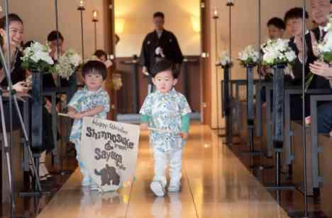 挙式のはじまりは、フラッグボーイの入場から。 可愛らしいお子様の姿に、皆様の表情が和らぎます。 新郎様のご入場では、いらっしゃるゲストから花を集め、カスミソウの花束を新婦様へプレゼントされる「ブーケストーリー」を。 おふたりのご縁を結ぶということをカタチにした「縁の契り」や、リングボーイが活躍した指輪の交換など、ゲストの皆様を交えたとてもあたたかな挙式でした♪