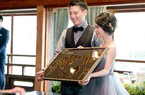 結婚式のキーアイテムとなったのが、名前入りピースと世界地図のボード。ゲストの受付時の感染対策としても、ペンで名前を記載する芳名帳ではなく、世界地図をモチーフにしたボードに名前入りのピースをはめてもらうオリジナルのアレンジに。披露宴では、数名のゲストより、おふたりとのエピソードを添えてピースをはめていただく演出を入れ、ついにボードが完成。ゲスト参加型の演出に会場も一体となったひとときとなりました。