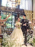 やわらかな自然光が堂内を照らし、ふたりとゲストを温かく包み込む空間での感動的な挙式の後は、フラワーシャワーのアフターセレモニーを。ゲストからの祝福が降り注ぐ瞬間は一生忘れられない想い出に。大切な人との距離が近いからこそ、誓いの感動も深まるはず。