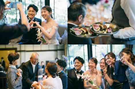 皆の顔が見れる距離感でお一人おひとりと乾杯をしながら ご友人や家族と一緒にソファに座って 写真を撮ったり 会話に花を咲かせたり おふたりも普段と変わらないリラックスした気持ちで アットホームなお時間が始まります ウェディングドレスは軽やかな素材と柔らかなレースのデザインが 上質でありながらナチュラルな雰囲気を叶え 春から夏の爽やかなシーズンにおすすめのウェディングドレス