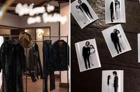 お気に入りのファッションアイテムを並べた ラックやデニム レザー ハットなど それぞれがふたりのスタイルを物語るコレクション。 一見ラフで無造作に見えるその空間も 実は一つひとつの配置や素材感にまで心を配った“計算されたシンプルさ” ゲストを惹きつけたのは モノトーンで統一された前撮りの写真。 無機質な背景に浮かぶおふたりの自然体な表情が まるでアートのように目を引きます。