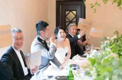 挙式後、ご家族様で会食会を楽しまれたおふたり。ちいさなお子様もいらっしゃったのでおふたりだけでなく、ゲストのみなさま全員が楽しんでくれる会にしたいという思いに溢れた時間に。「お料理の価格あてゲーム」などを楽しまれ、会話が途切れることがなく過ごされました。