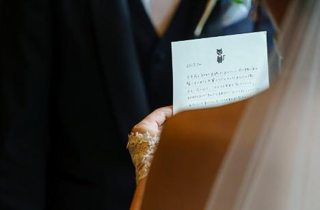 伝える想いを大切にされたかったおふたりは ゲストに誓いを立てる人前式をお選びなりました 皆様からの承認をいただきお互いに誓いの言葉を読み合います おふたりらしさが伝わる挙式だからこそ 大切な方々の心にもしっかり届きます