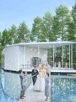 建築家青木淳氏がデザインした水上に浮かぶチャペル。水の音色に一番近いと言われるハープの生演奏の中、優雅なひとときを叶えて。左右非対称なデザインで間接照明が花嫁姿