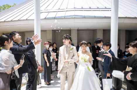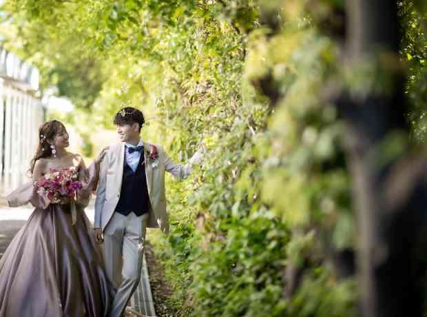 9,000坪の敷地が広がる当館ならではの演出を沢山取り入れ、非日常空間でゲストをおもてなし。緑いっぱいの空間でのフラワーシャワーではゲストと一緒に1つのイベントを行い、動画映えするシーンを作り上げました。ご披露宴後はガーデンでフォトタイムをとってゲスト一人一人へ感謝の気持ちを伝えながらお見送りを。一日中素敵な写真を撮影しました。