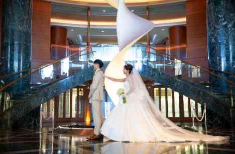 ドレス・タキシード姿にお着換えされたお二人が向かったのは、ホテルの象徴とする美術家・吉原悠博氏がデザインした空間、"ファウンテンコート"。フォトスポットとしても大人気のスポットでご新婦様がご新郎様の肩をたたき ドレス姿をお披露目すると新郎様から花束のプレゼントが。 ご新郎様から愛のこもったサプライズにご新婦様は笑顔いっぱいで。挙式の前におふたりの絆が更に深まったシーンとなりました