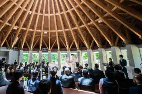 おふたりが選んだのはキリスト式。ご新郎様はおひとりでご入場されご新婦様はお父様とご入場。たくさんのゲストに見守られながら永遠の愛を誓い合ったおふたり。窓一面に緑が広がり、木の温もりとコンクリートのアートが広がる唯一無二の空間で、洗練されたセレモニーとなりました。退場したのちは緑いっぱいの空間でフラワーシャワーやブーケトスのセレモニーを行いました。