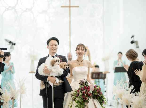 愛犬2匹もドレスアップしておふたりと一緒に主役となるオリジナル挙式に。入場の際にはリングドックとしてご登場いただいた後、指輪交換や誓いの言葉も愛犬を抱っこして…!結婚証明書は愛犬の肉球を押してゲストの前で完成させました。入場~退場までずっと愛犬と一緒に過ごす愛犬への愛が溢れるプログラムに、チャペル内は自然と笑顔でいっぱいとなる和やかな雰囲気に包まれました。