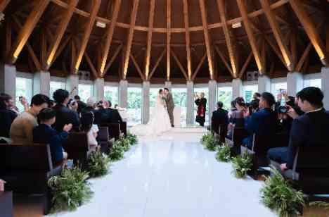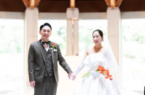 檜の香りが包み込む、空間デザイナーが手掛けたチャペルrinを選んだお二人。ご新婦様はサテン生地の艶感たっぷりのドレスに身を包み、こだわりのアームブーケを合わせてセンスが光るトータルコーディネートに。円形に設計されている空間なので、後ろの席のゲストまでしっかりとおふたりの姿をご覧いただける設計。挙式中はほとんどのゲストがお席からお写真や動画を沢山撮影されていたのが印象的でした。