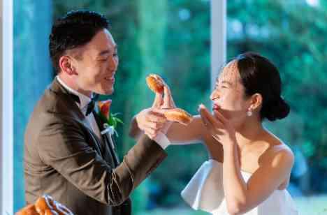 ウエディングケーキもふたりらしいものに!"ファーストバイト"よりももっと笑顔いっぱいになるシーンはないかな…とお打ち合わせを重ねる中で選んだのは、ウエディングケーキのてっぺんにドーナッツがあしらわれたオリジナルケーキ。お互いに食べさせるのではなく、おふたりが同日に食べさせる"同時バイト"を行いました。中の良さが伝わる瞬間にゲストもほっこりでした。