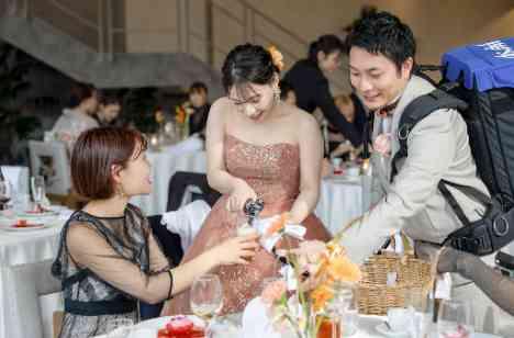 新郎が背負うビールサーバーは、ゲスト一人ひとりに直接“ありがとう”を届ける、アットホームな結婚式ならではの演出です。「今日は来てくれてありがとう」 「ゆっくり楽しんでね」そんな言葉と一緒に注がれる一杯は、形式的な乾杯ではなく、心の通ったおもてなし。 ゲストのテーブルを回りながら、会話が生まれ、笑顔が広がり、会場全体が自然とひとつになります。